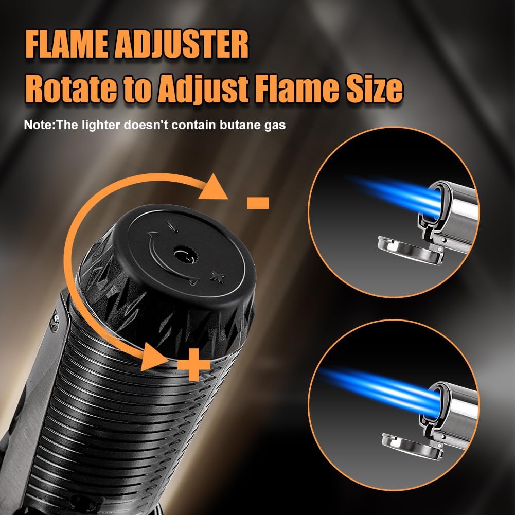 WINDPROOF ADJUSTABLE TORCH: This torch lighter has designed a flame regulator on the bottom, you can adjust the flame length and size according to your needs without any tool. Help you save fuel and extend the life of your lighter at the same time.